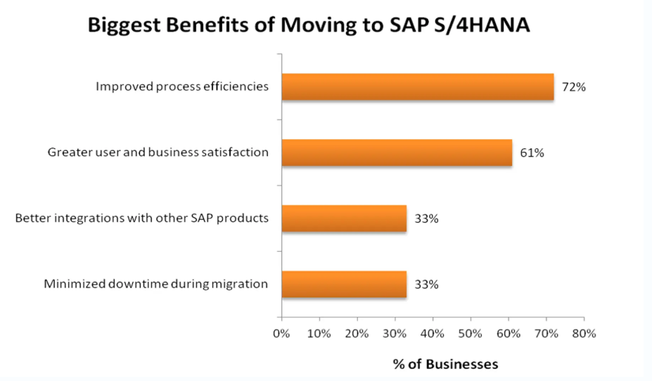 According to 72% of businesses, SAP S/4HANA has the most significant benefits in 2021, with improved efficiency being the biggest benefit followed by greater satisfaction (61%). Other advantages of implementing SAP S/4HANA include: